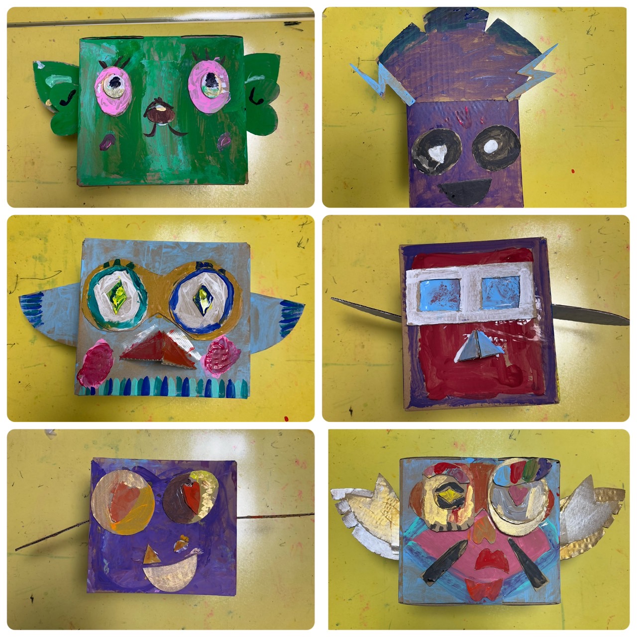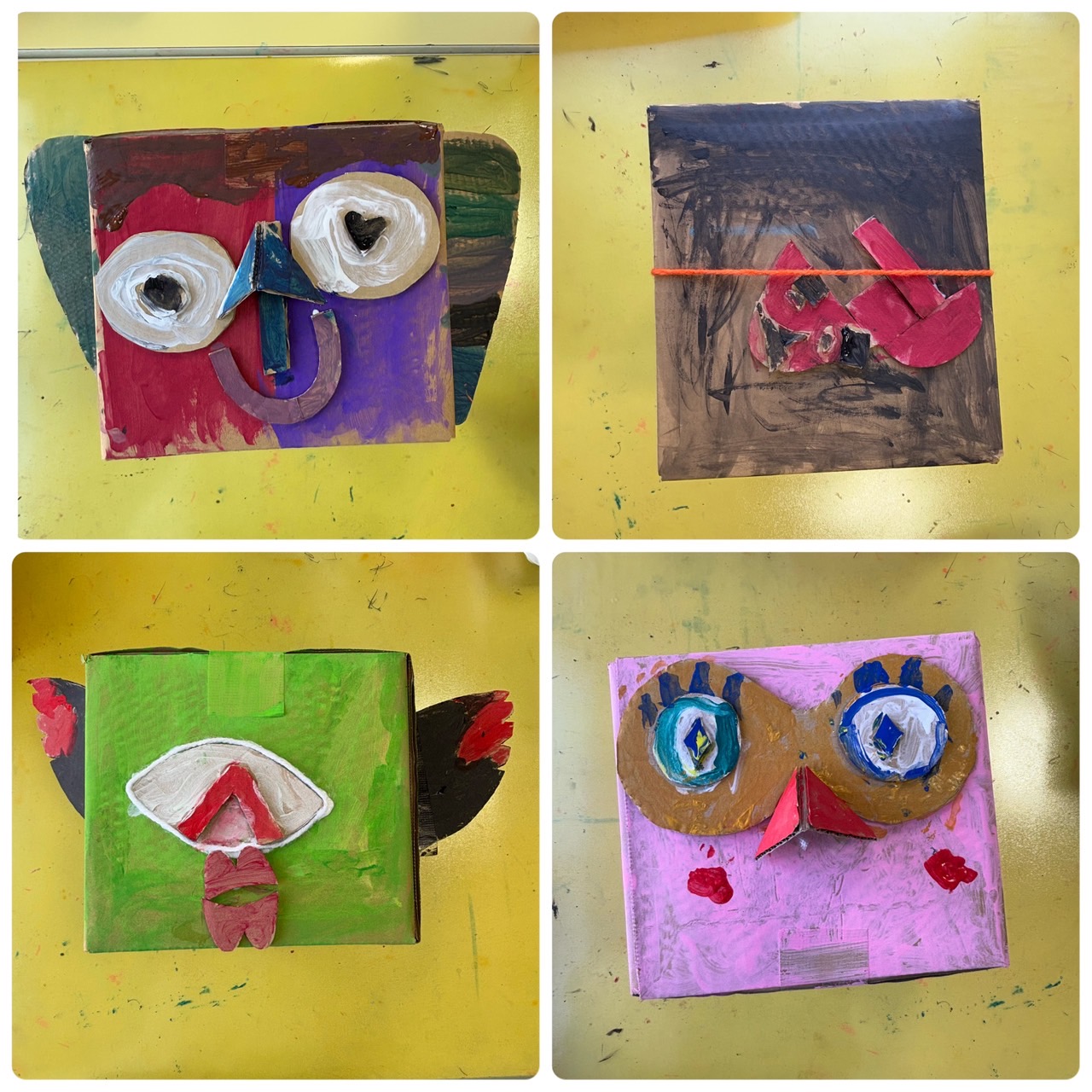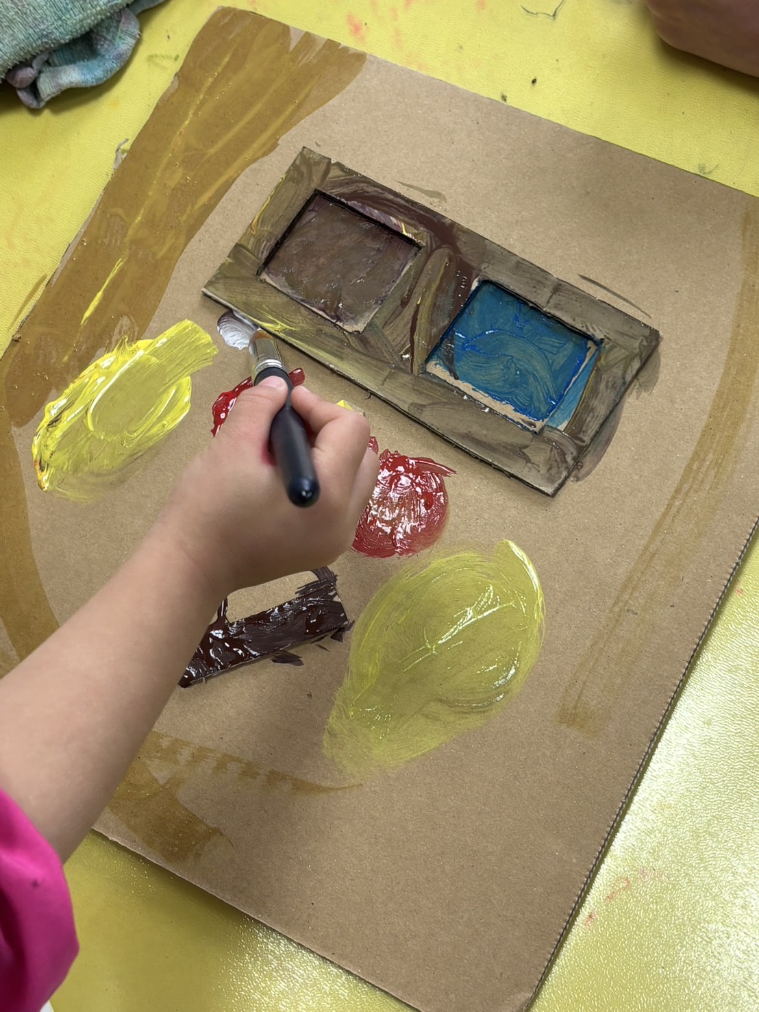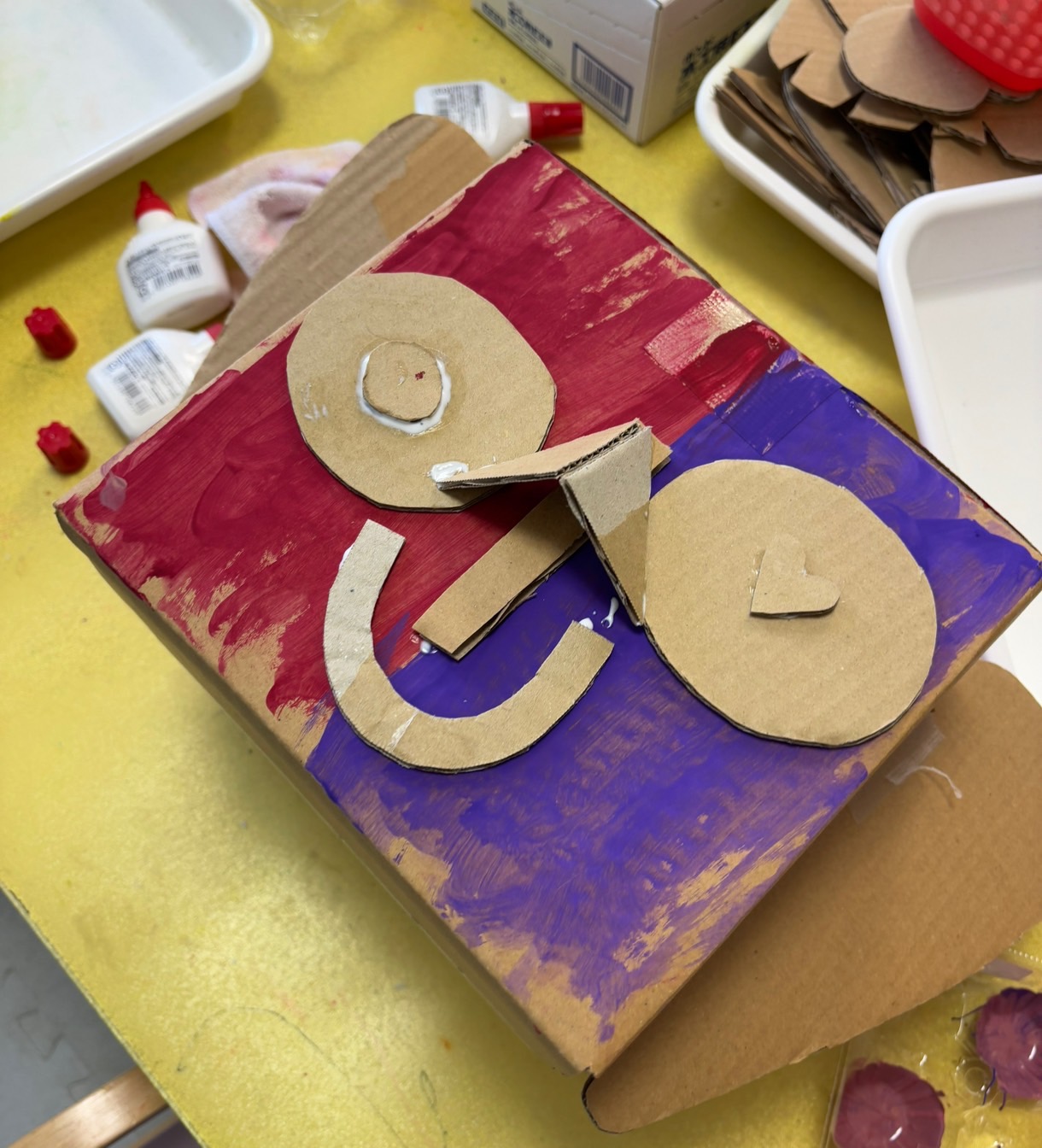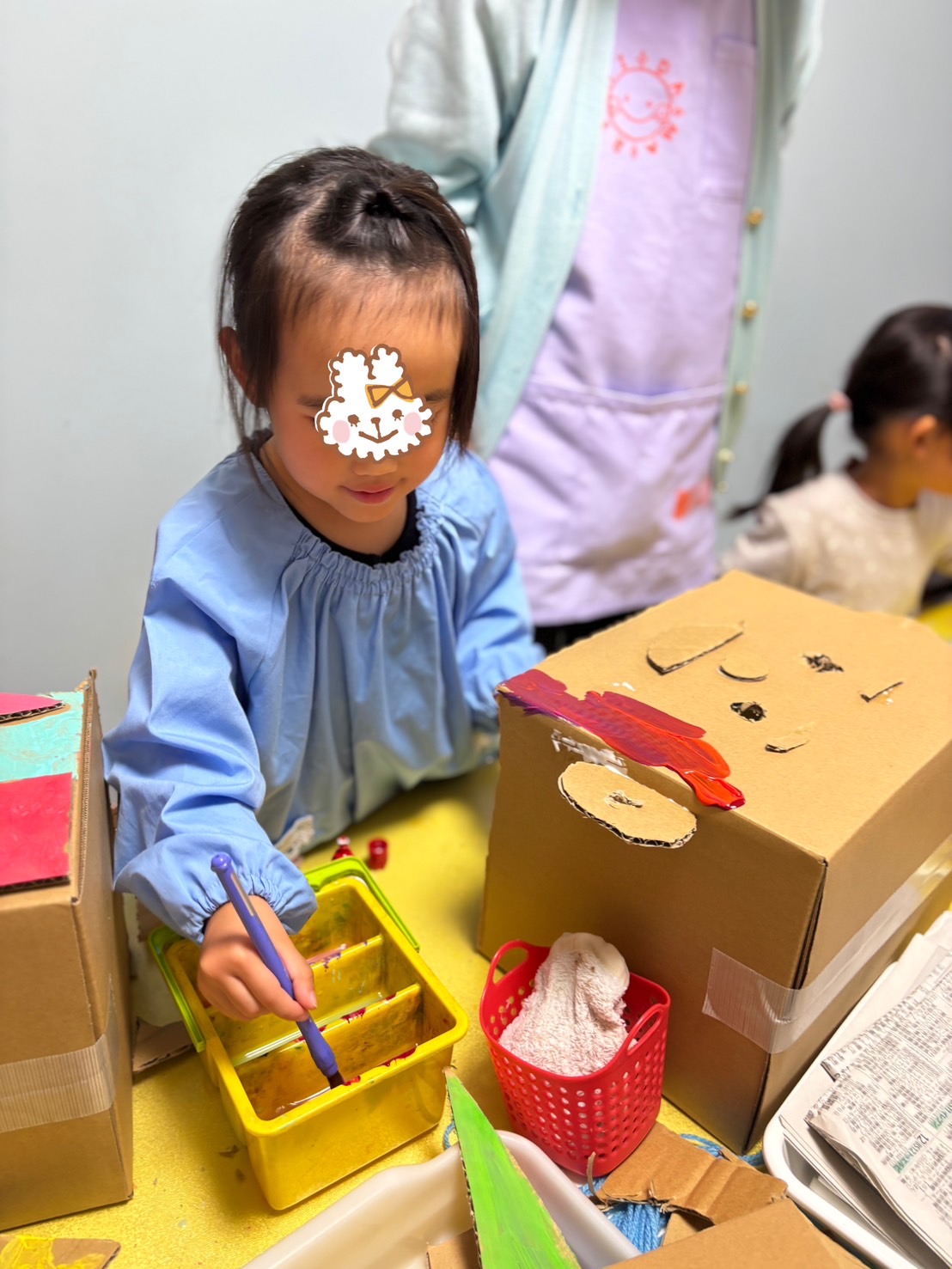 ダンボールで作ったお顔に絵の具で色を塗りました✨