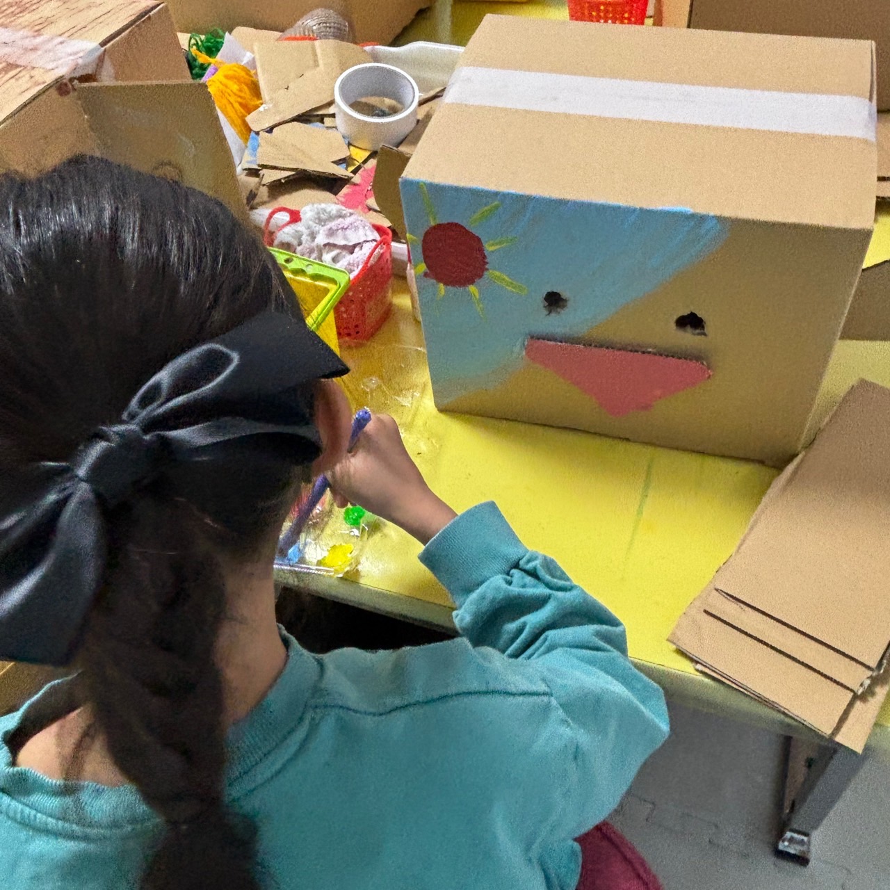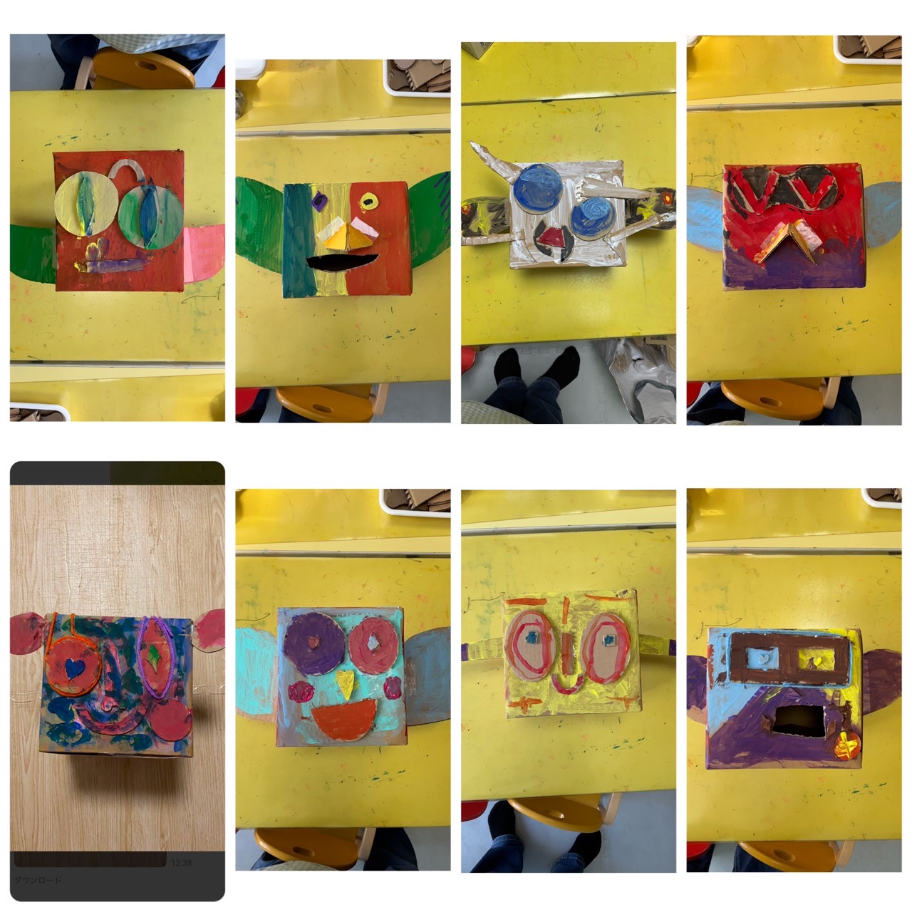 今月のキッズアートワークショップでは、ダンボールを使って面白いお顔を作って、トーテムポール制作を♪