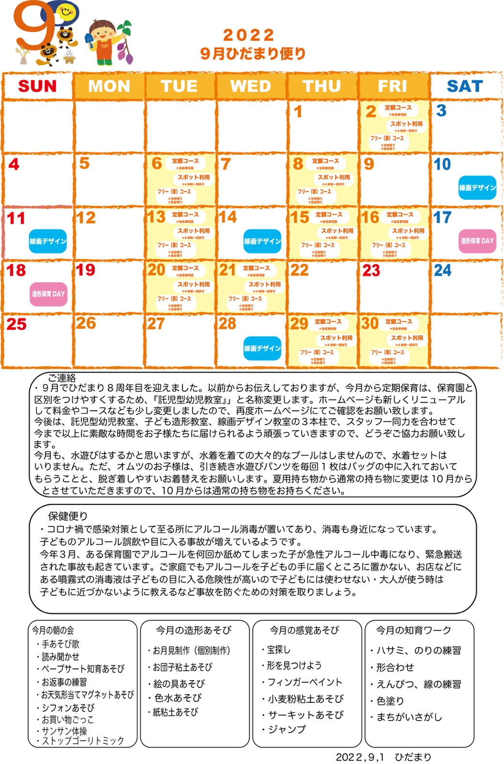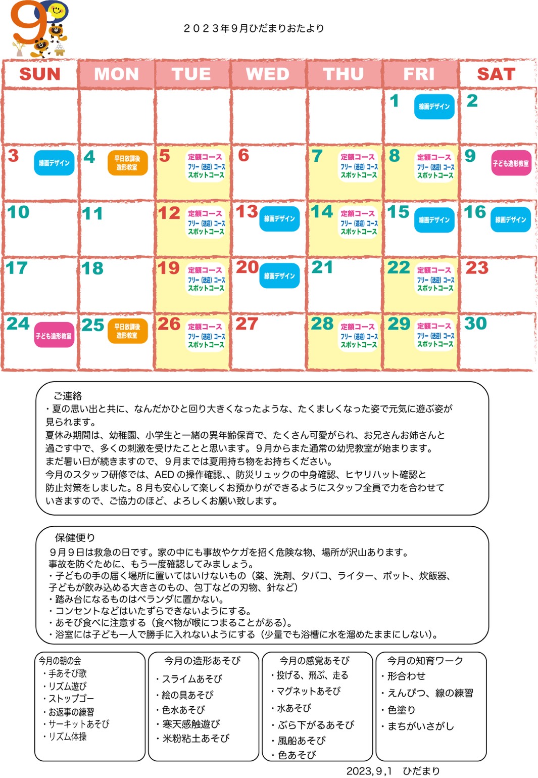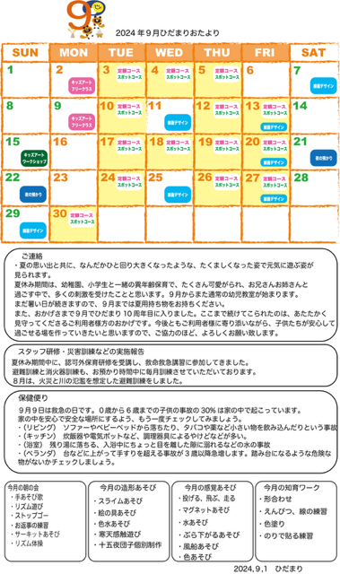 2024年9月のひだまり託児型幼児教室お便り更新しました。