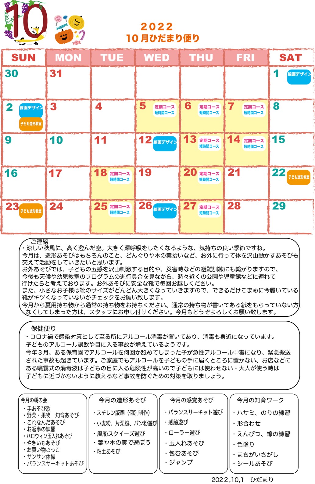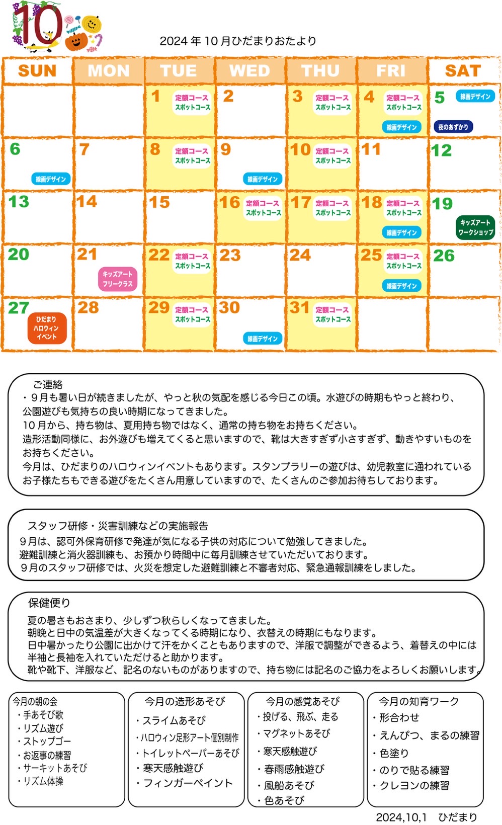 2024年10月のひだまり託児型幼児教室お便り更新しました。