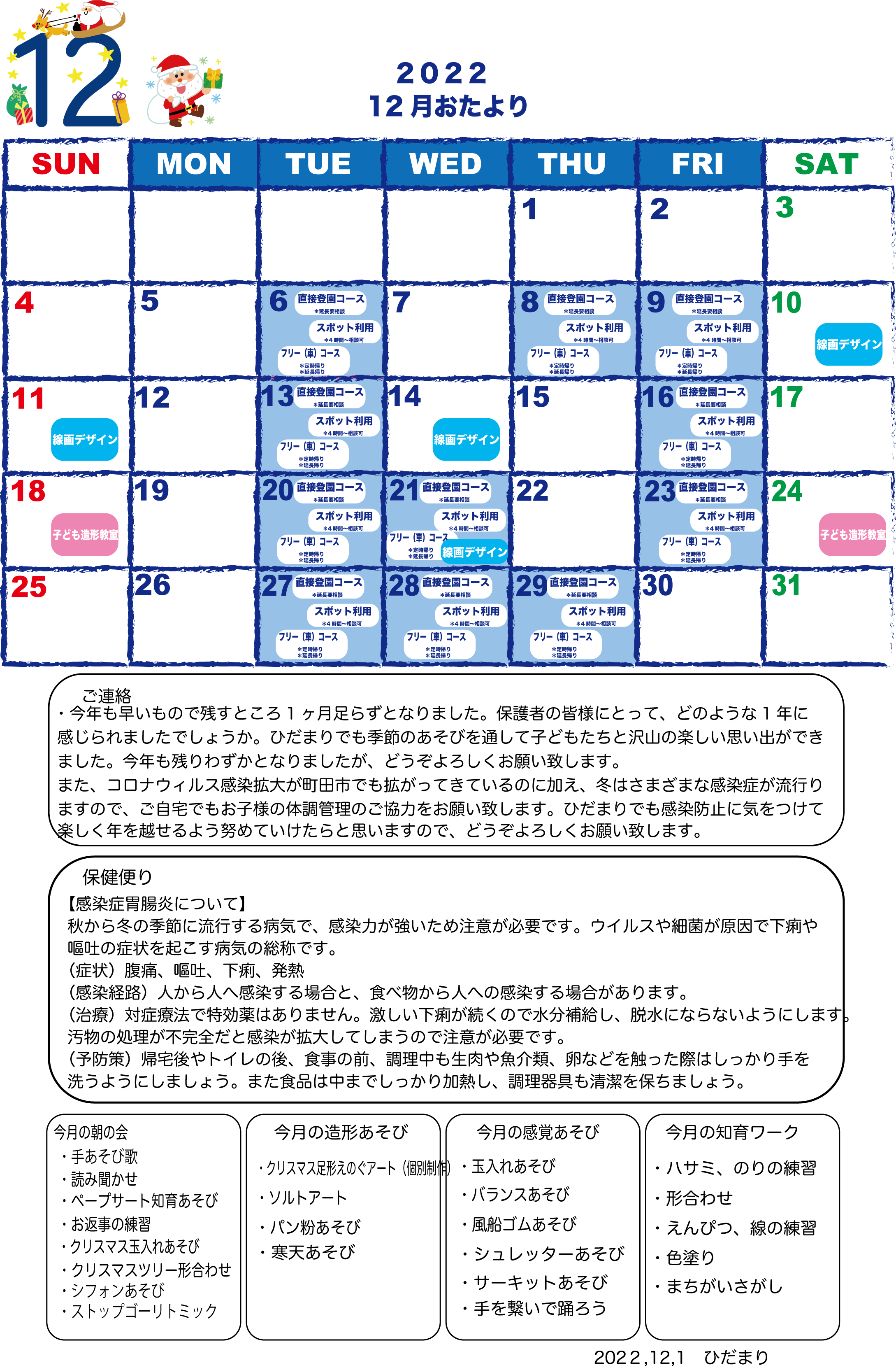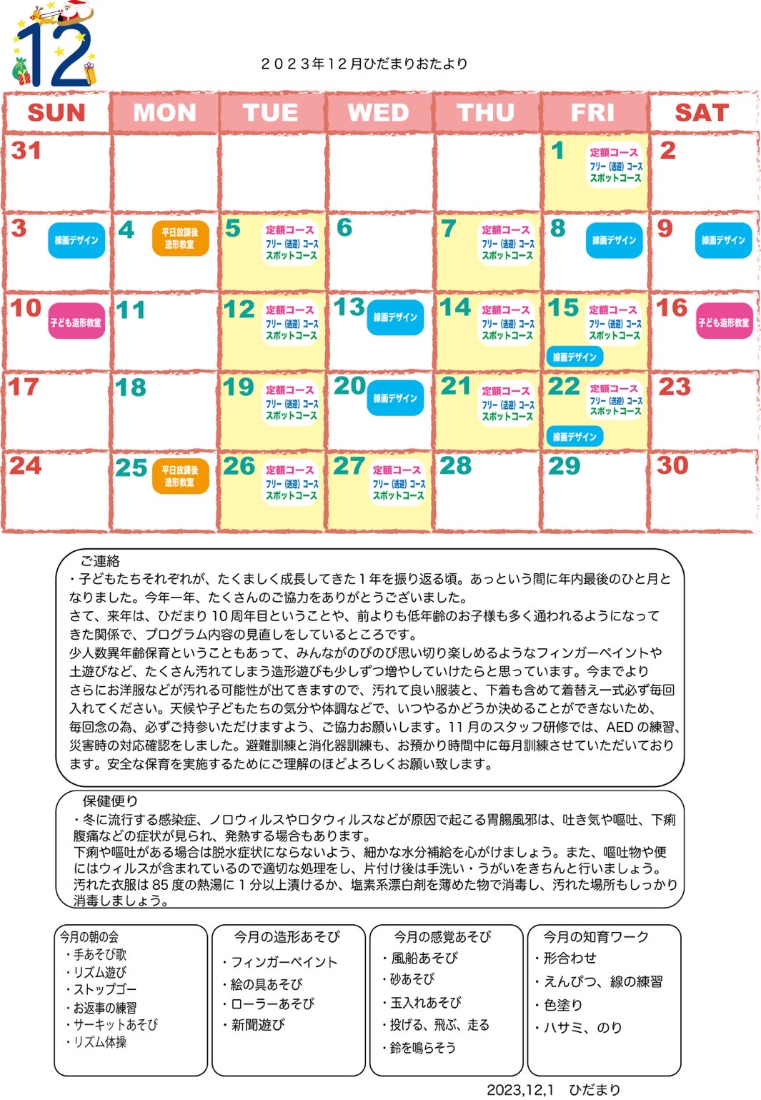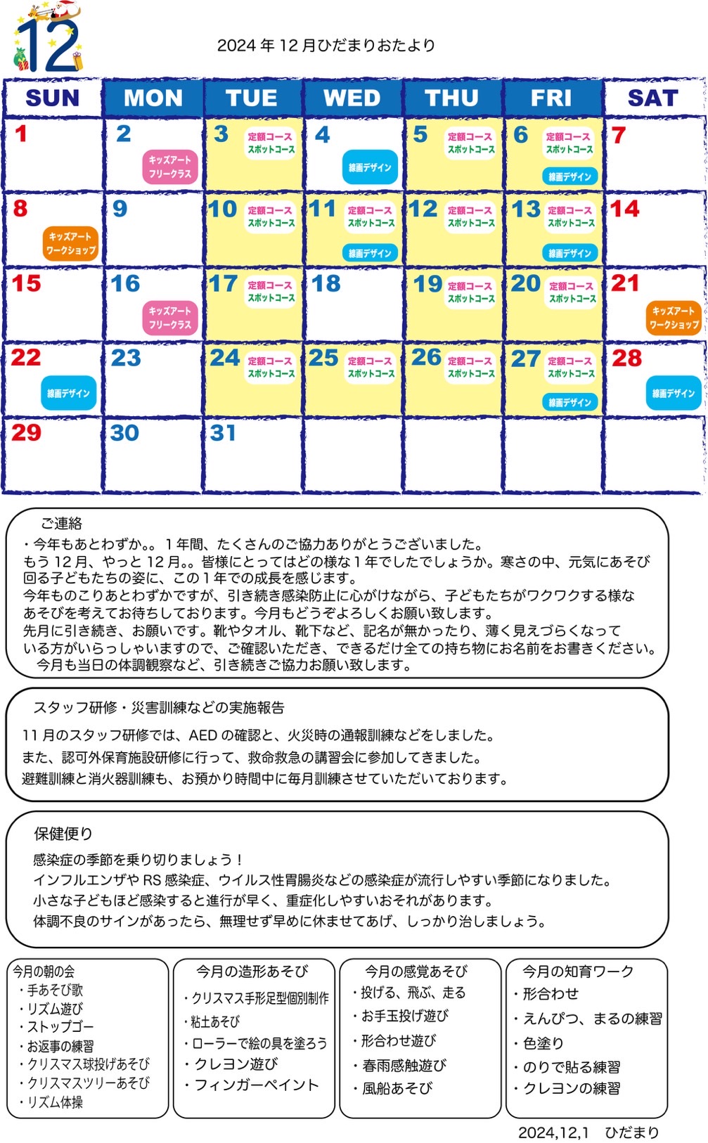 2024年12月のひだまり託児型幼児教室お便り更新しました。