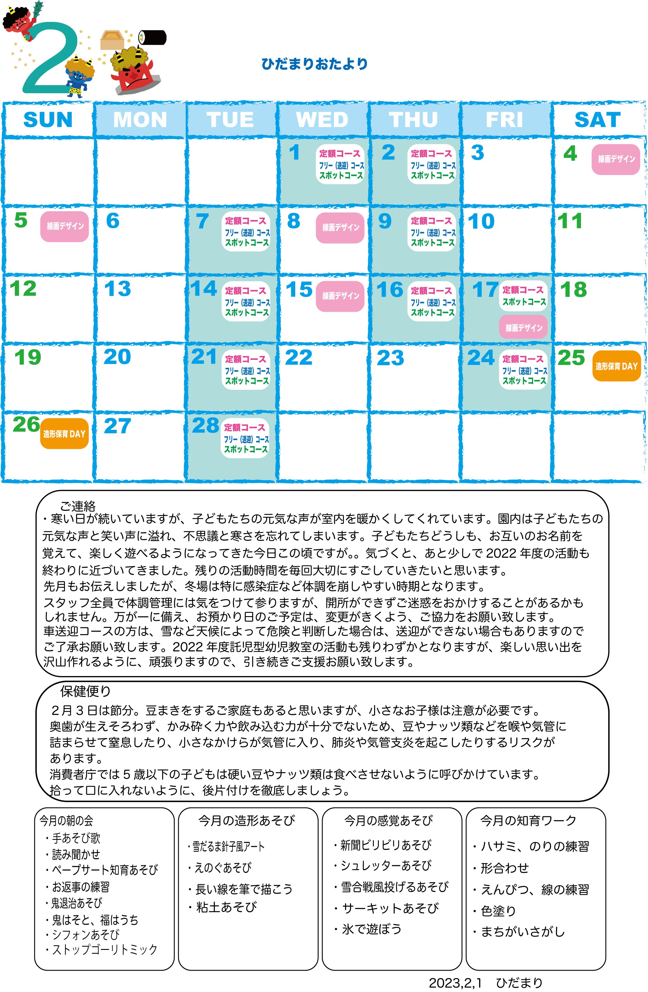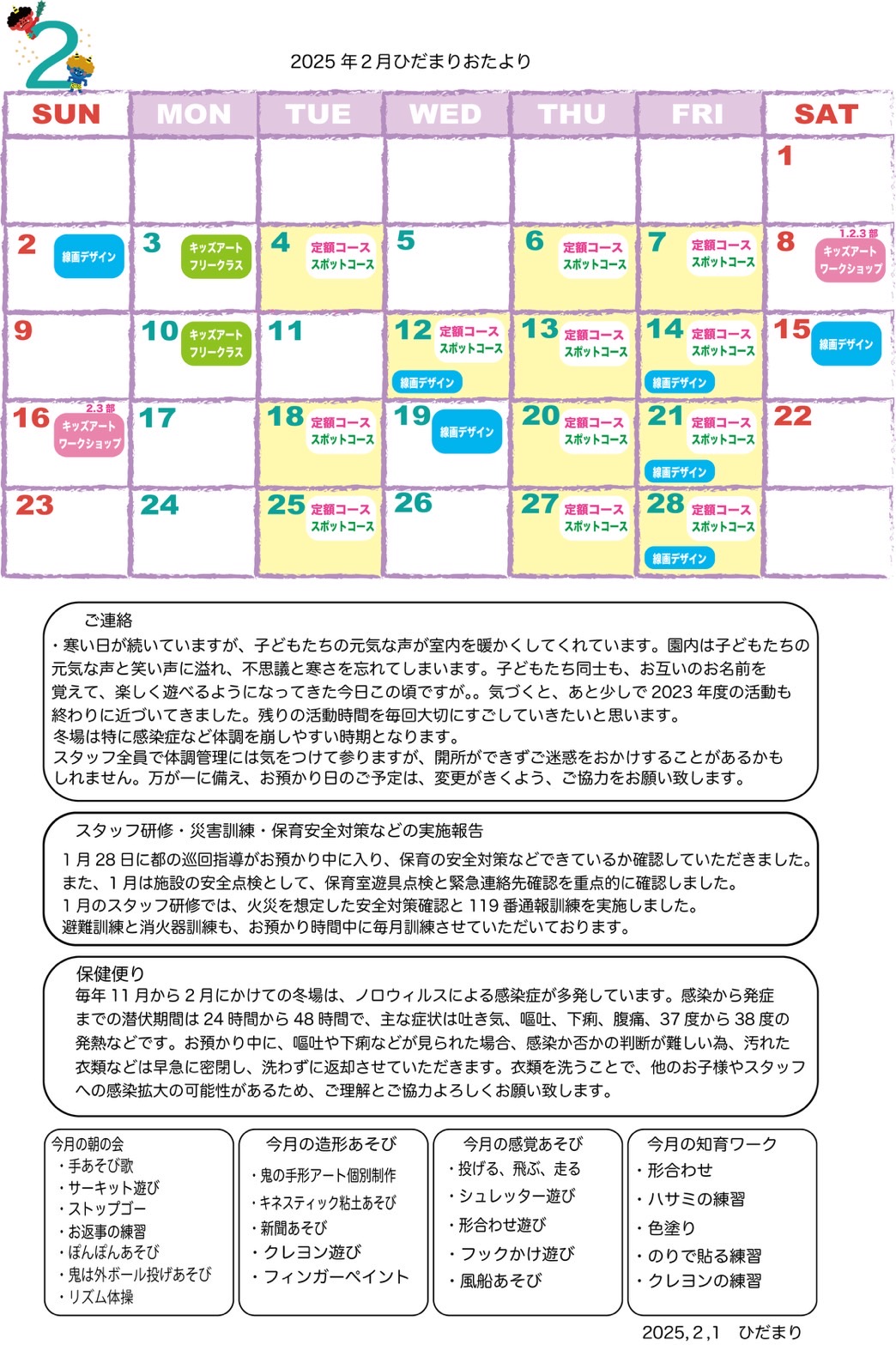 2025年2月のひだまり託児型幼児教室お便り更新しました。