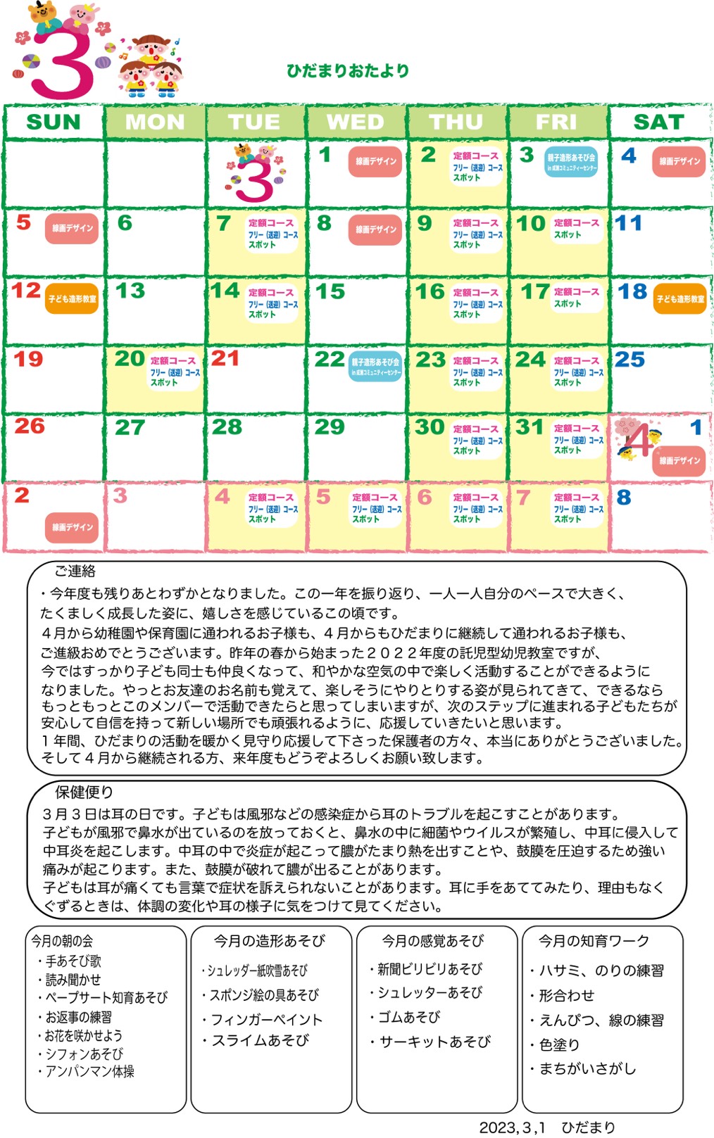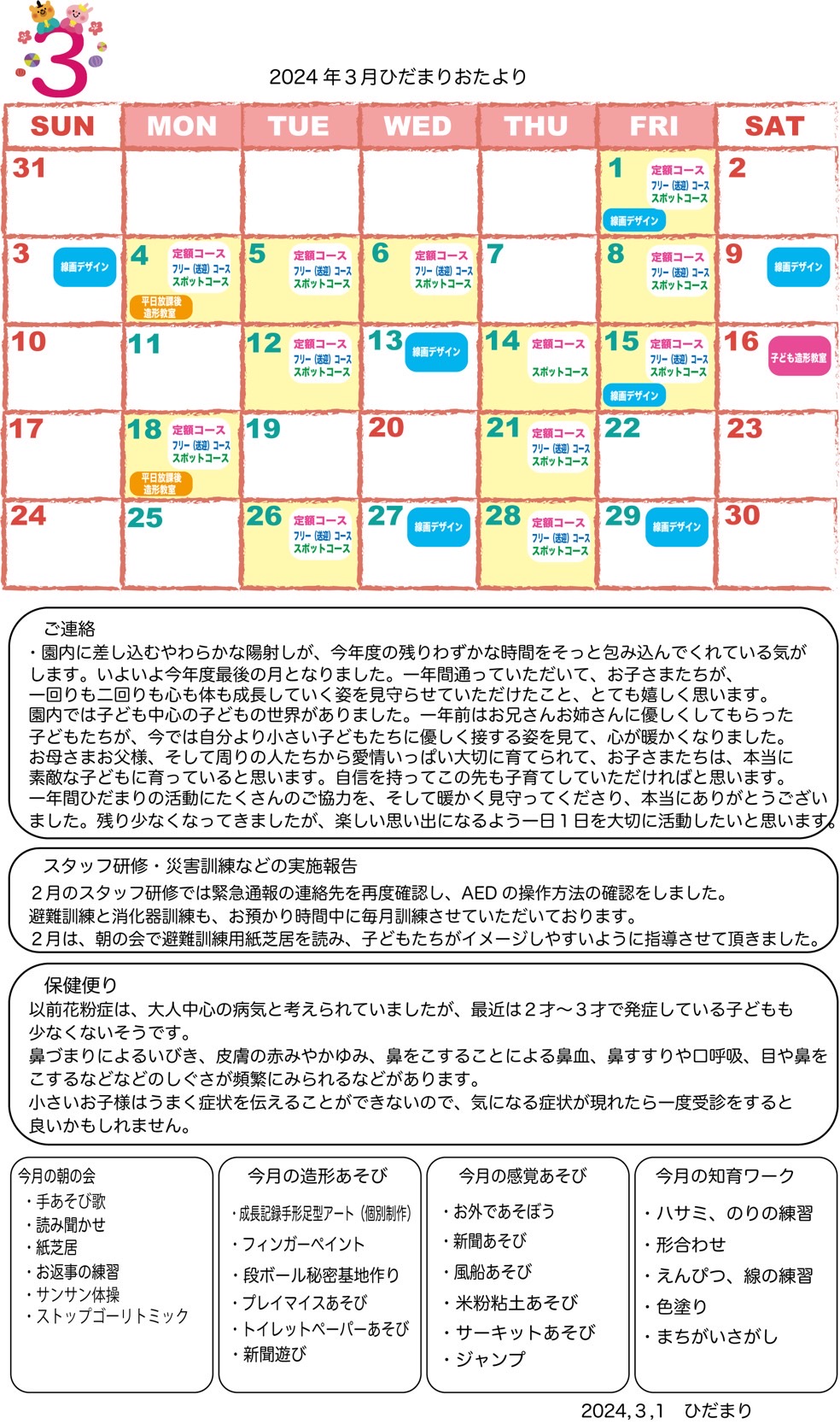 2024年3月のひだまり託児型幼児教室お便り更新しました。