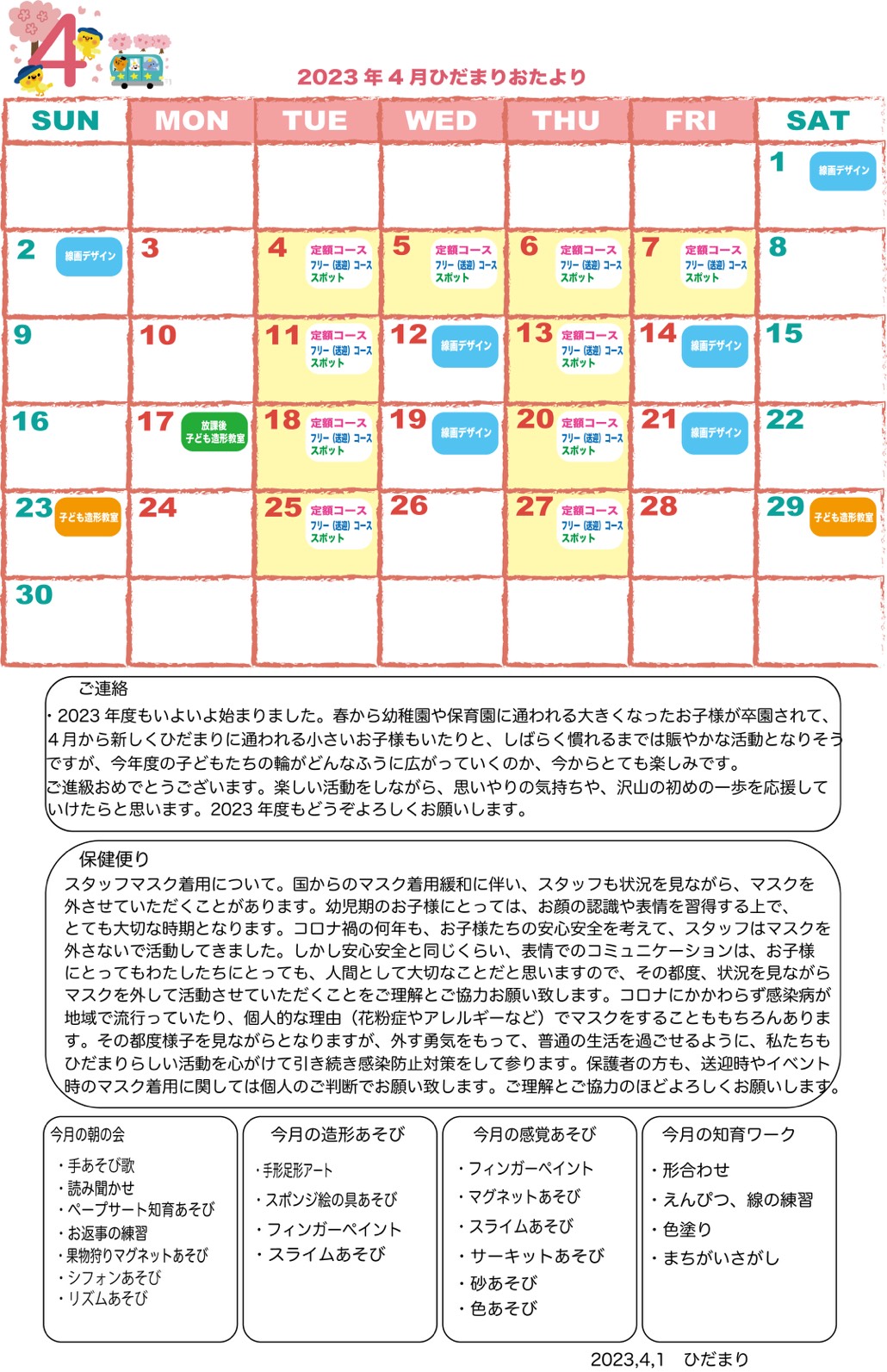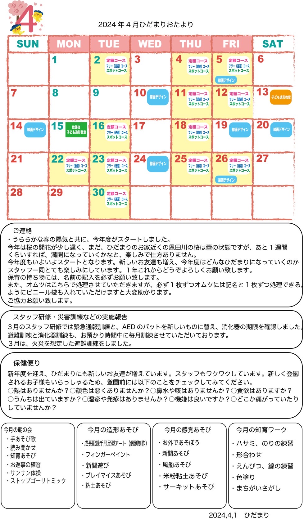 2024年4月のひだまり託児型幼児教室お便り更新しました。