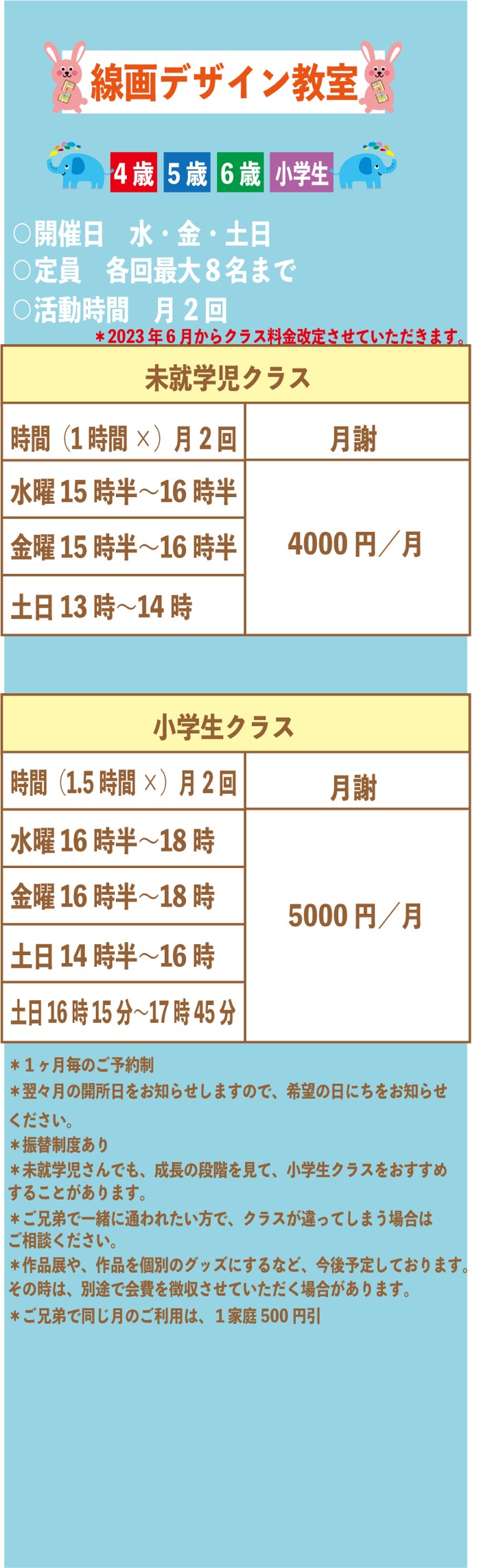 託児型幼児教室がなくなる分、子どもたちとの造形活動、デザイン活動により一層力を入れて、全力で子供達と向き合っていきたいと思いますので、今後とも末長くお付き合いいただけますと幸いです。