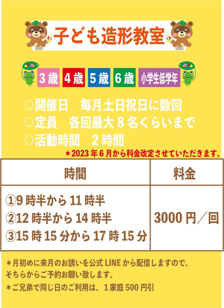 【子ども造形教室へ通われている方、ご検討中の方へ。。料金改定のお知らせです】