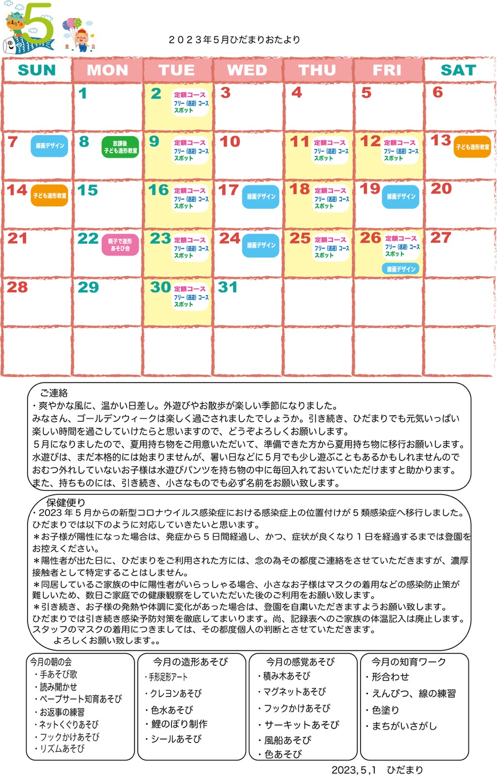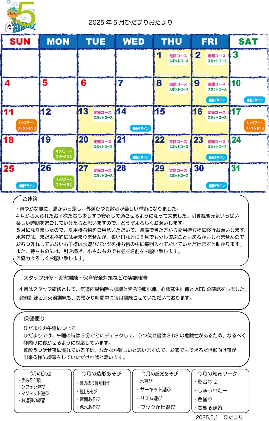 2025年5月のひだまり託児型幼児教室お便り更新しました。