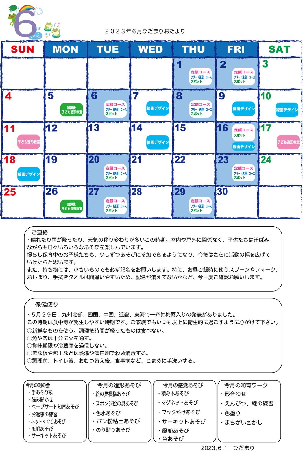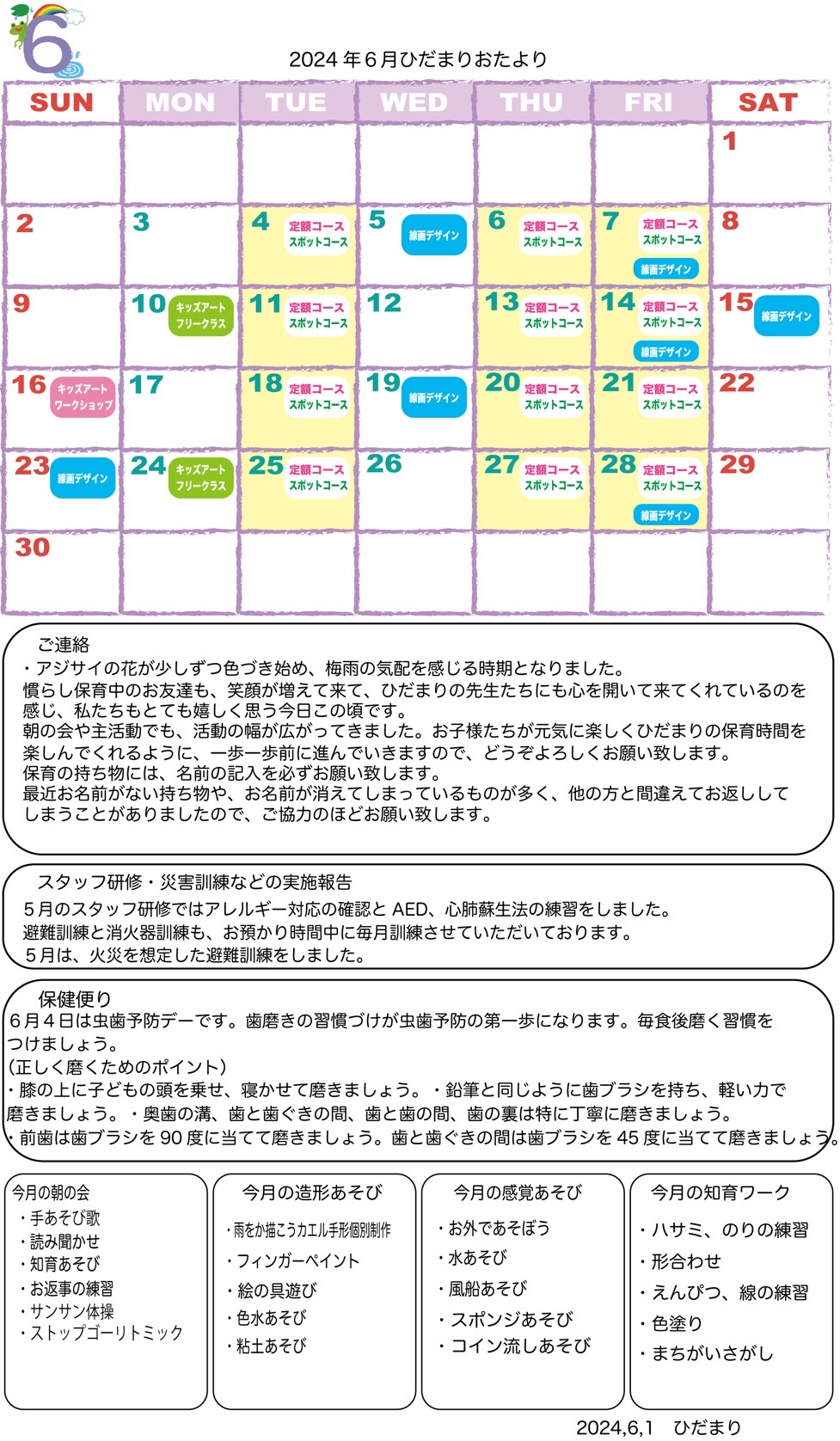 2024年6月のひだまり託児型幼児教室お便り更新しました。