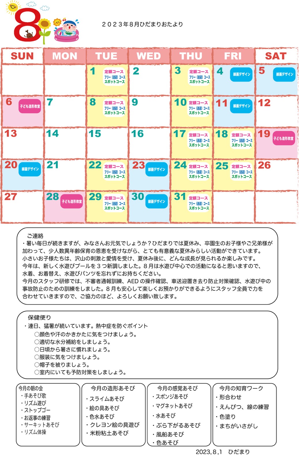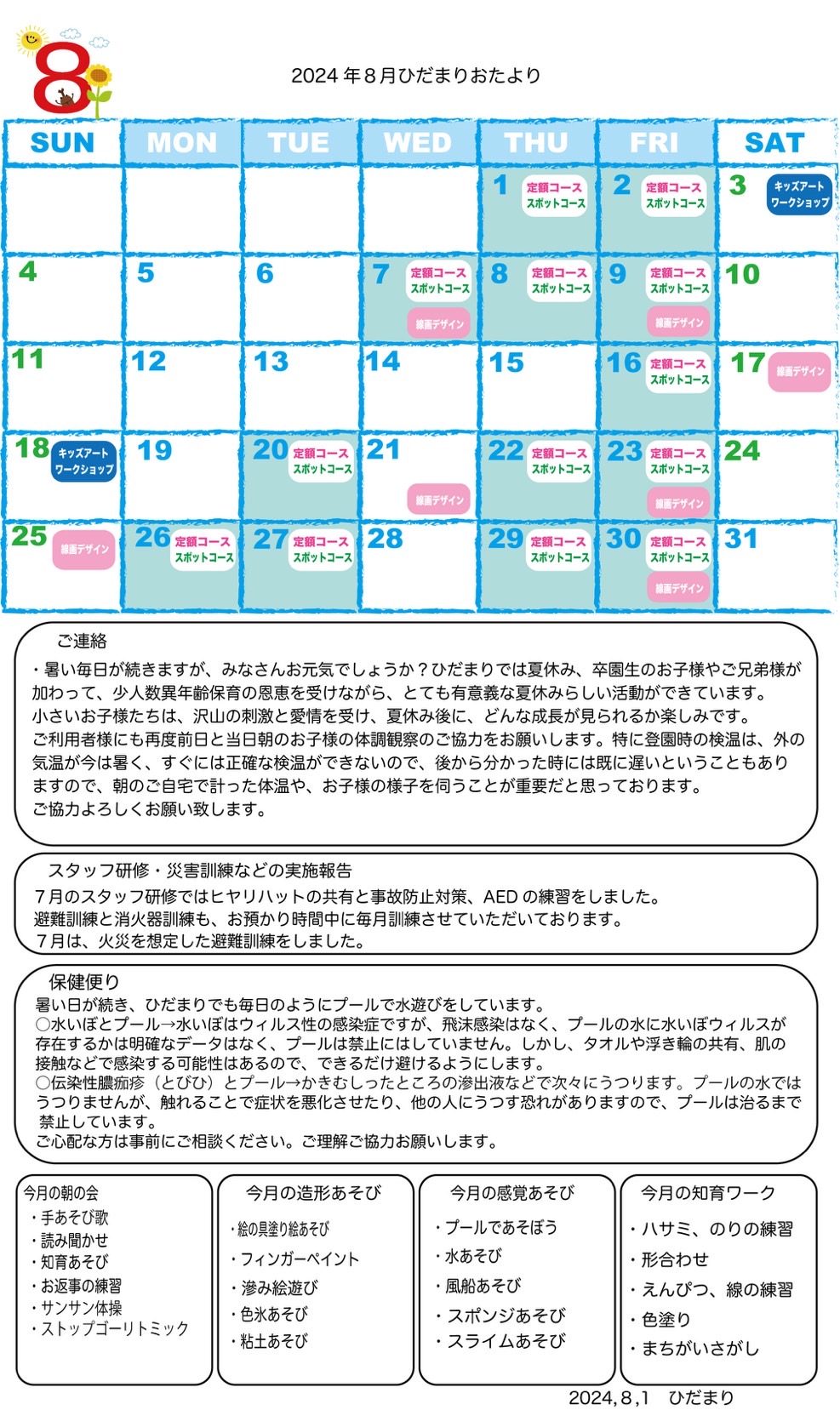 2024年8月のひだまり託児型幼児教室お便り更新しました。