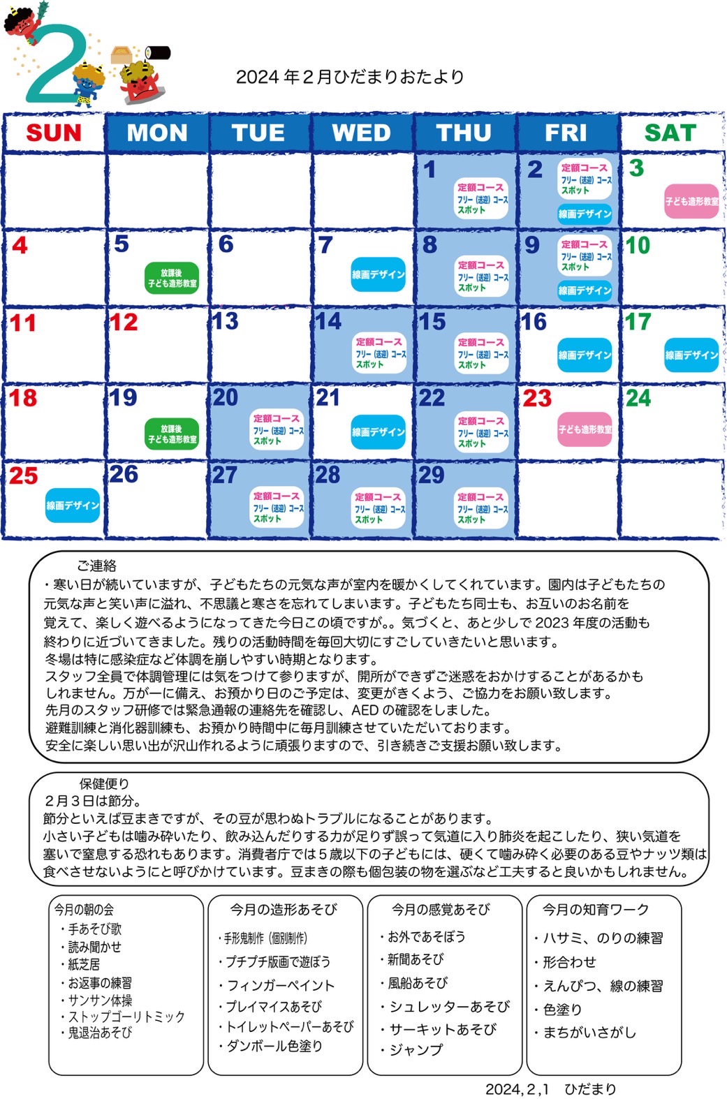 2024年2月のひだまり託児型幼児教室お便り更新しました。