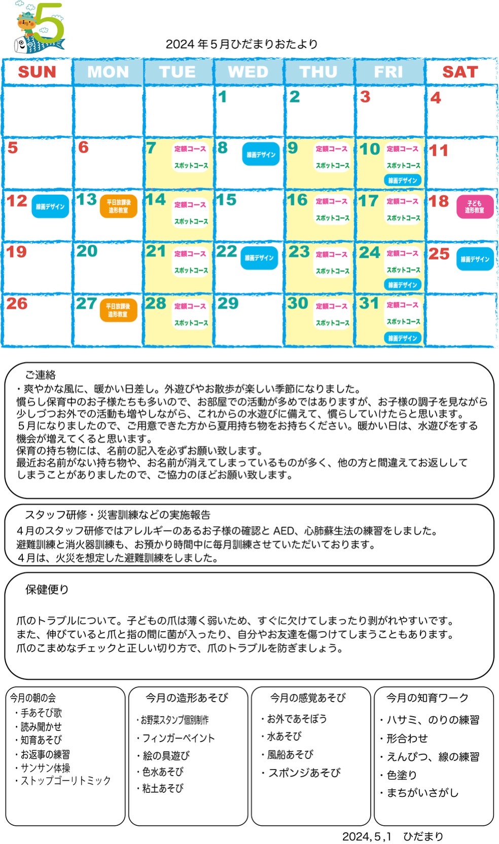 2024年5月のひだまり託児型幼児教室お便り更新しました。