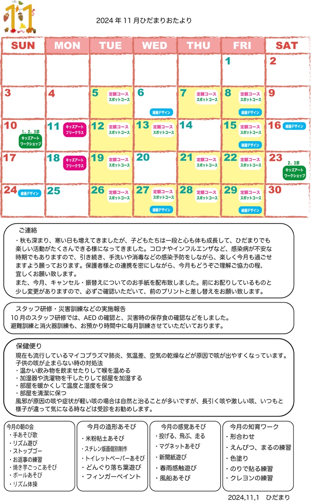 2024年11月のひだまり託児型幼児教室お便り更新しました。