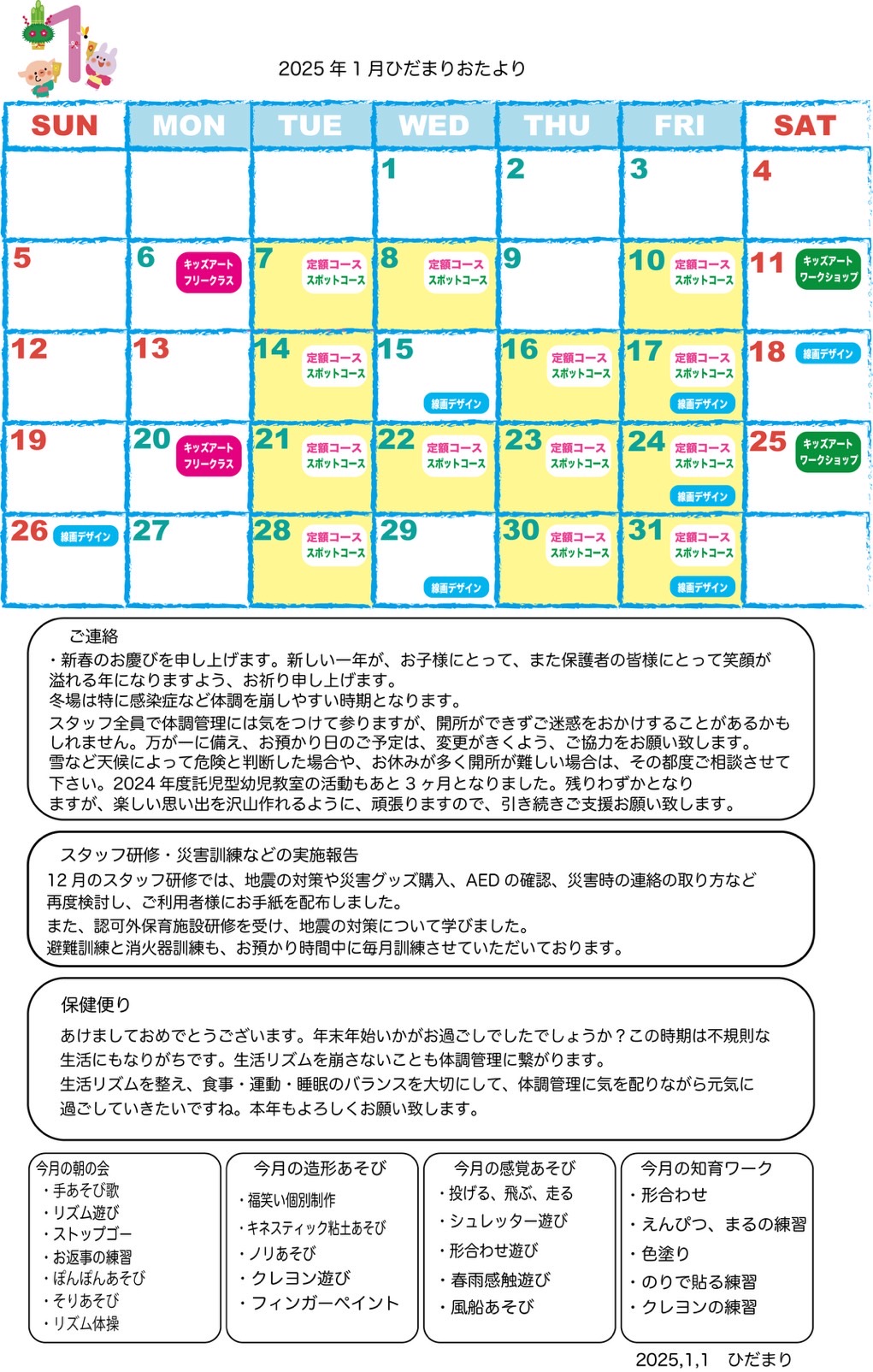 2025年1月のひだまり託児型幼児教室お便り更新しました。