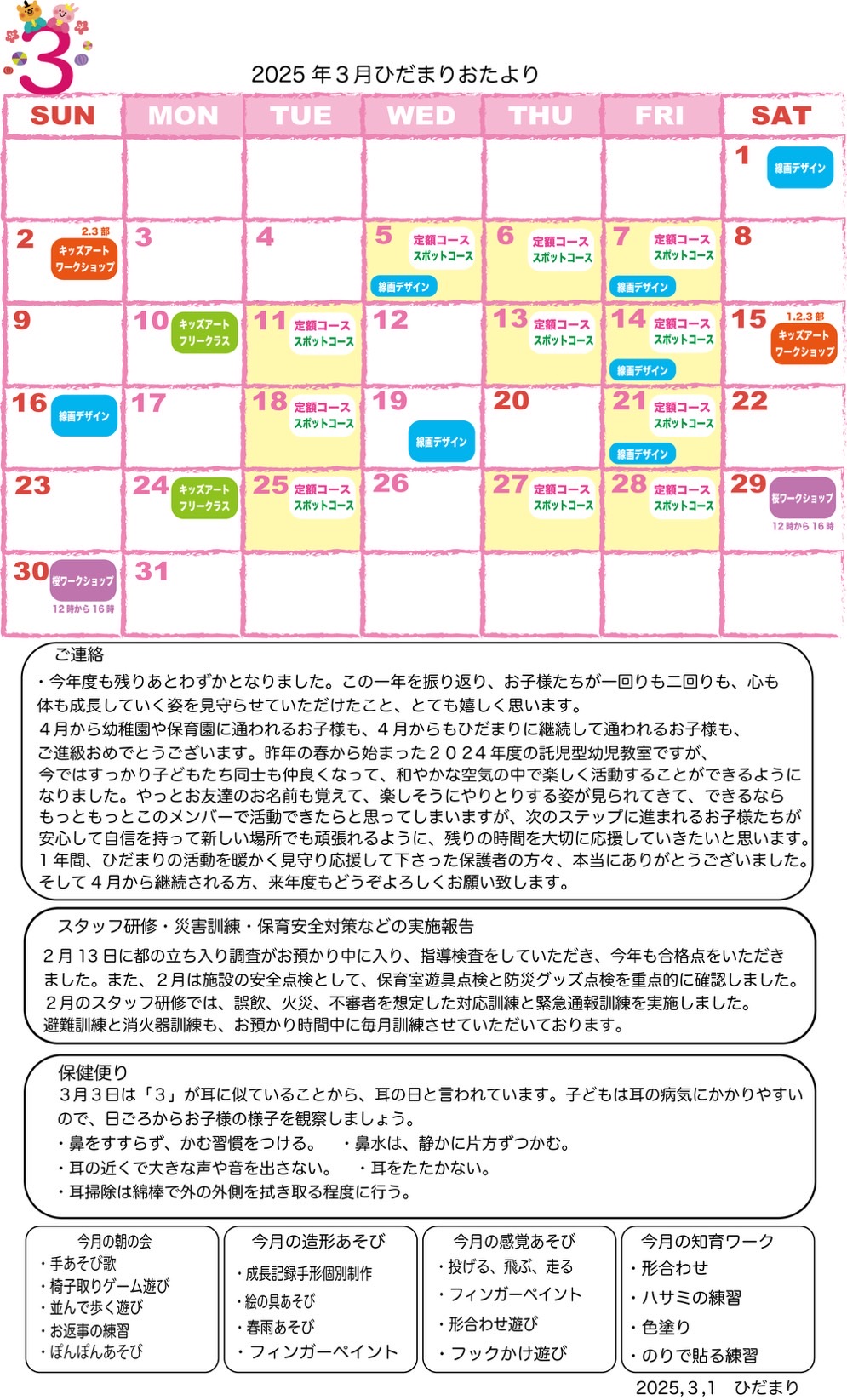 2025年3月のひだまり託児型幼児教室お便り更新しました。