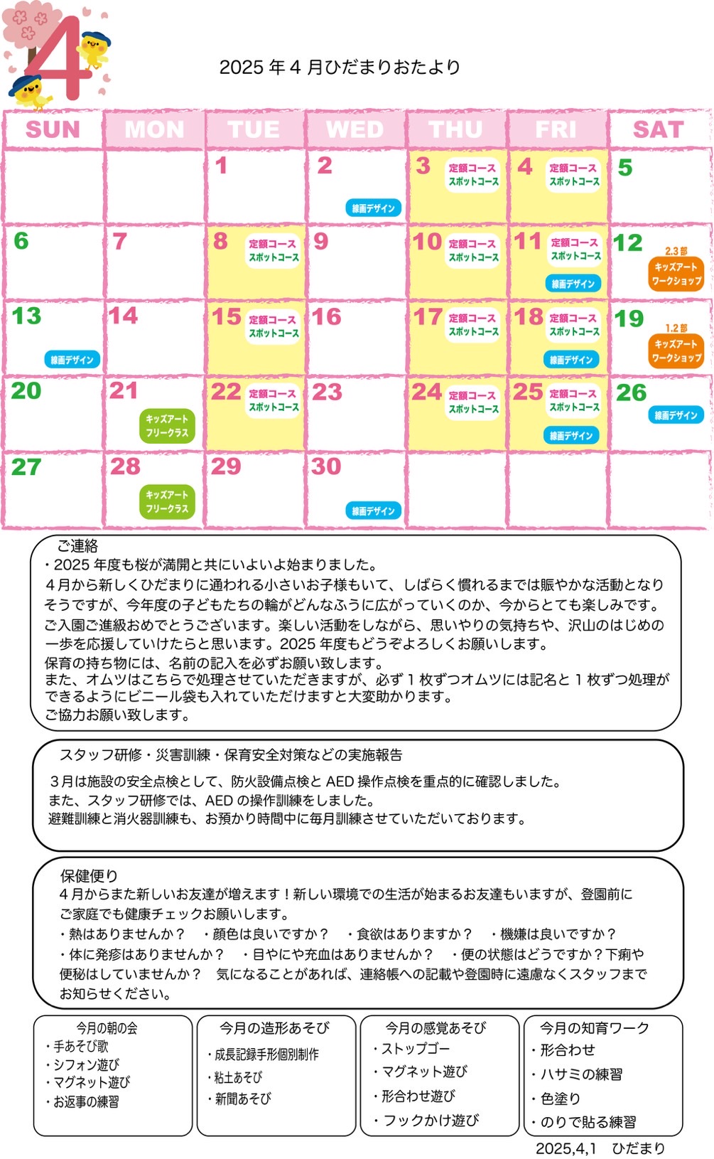 2025年4月のひだまり託児型幼児教室お便り更新しました。