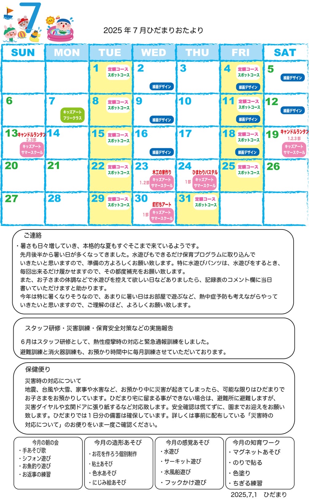 2025年7月のひだまり託児型幼児教室お便り更新しました。