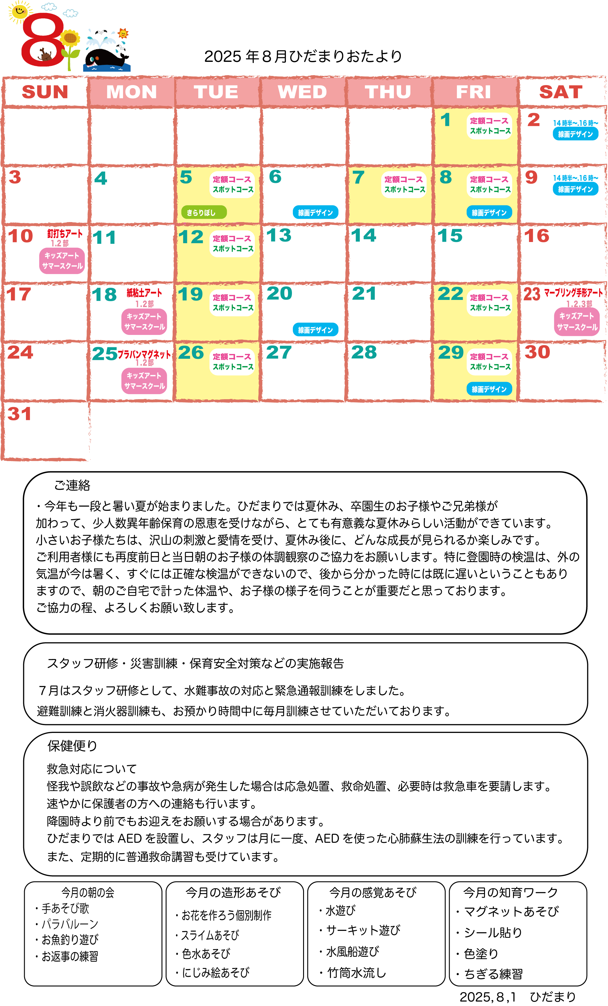 2025年8月のひだまり託児型幼児教室お便り更新しました。