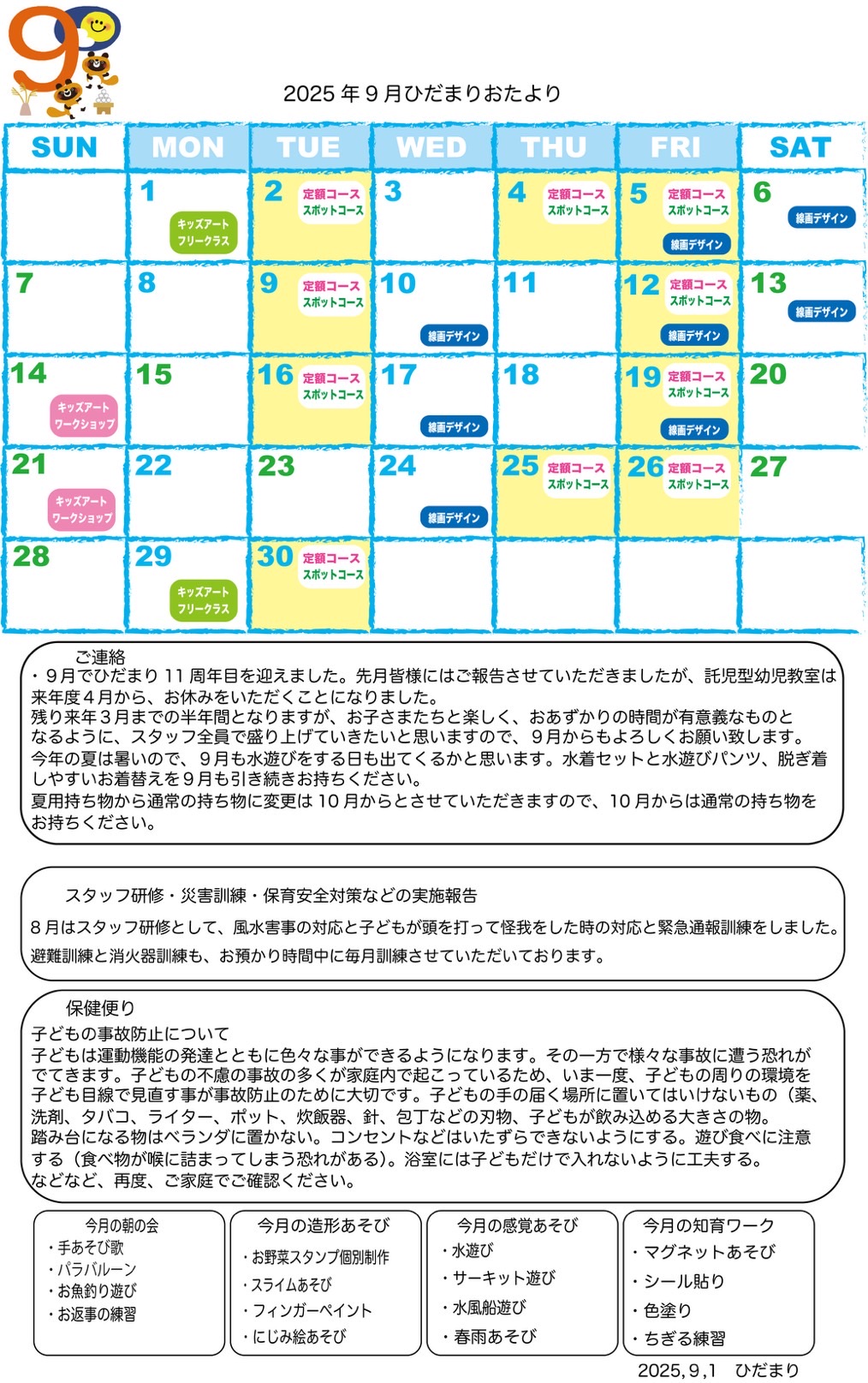 2025年9月のひだまり託児型幼児教室お便り更新しました。